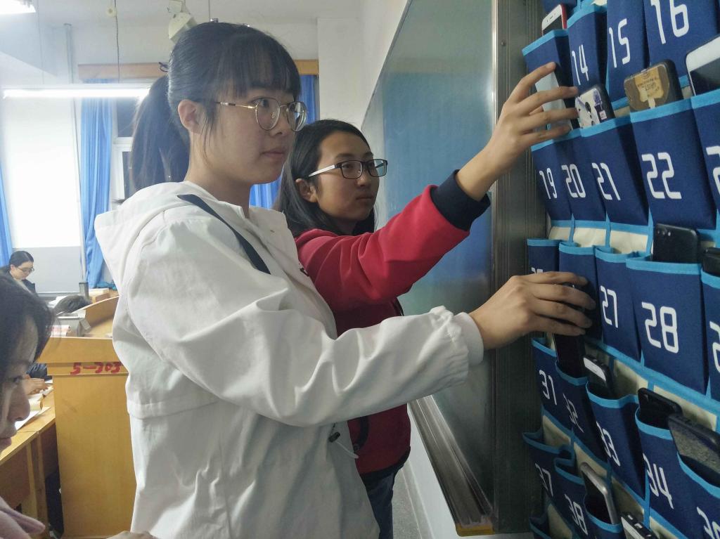新学期伊始,在校内教学楼各教室内讲台两侧,出现了学校统一制作安装的“神器”——手机存放袋。