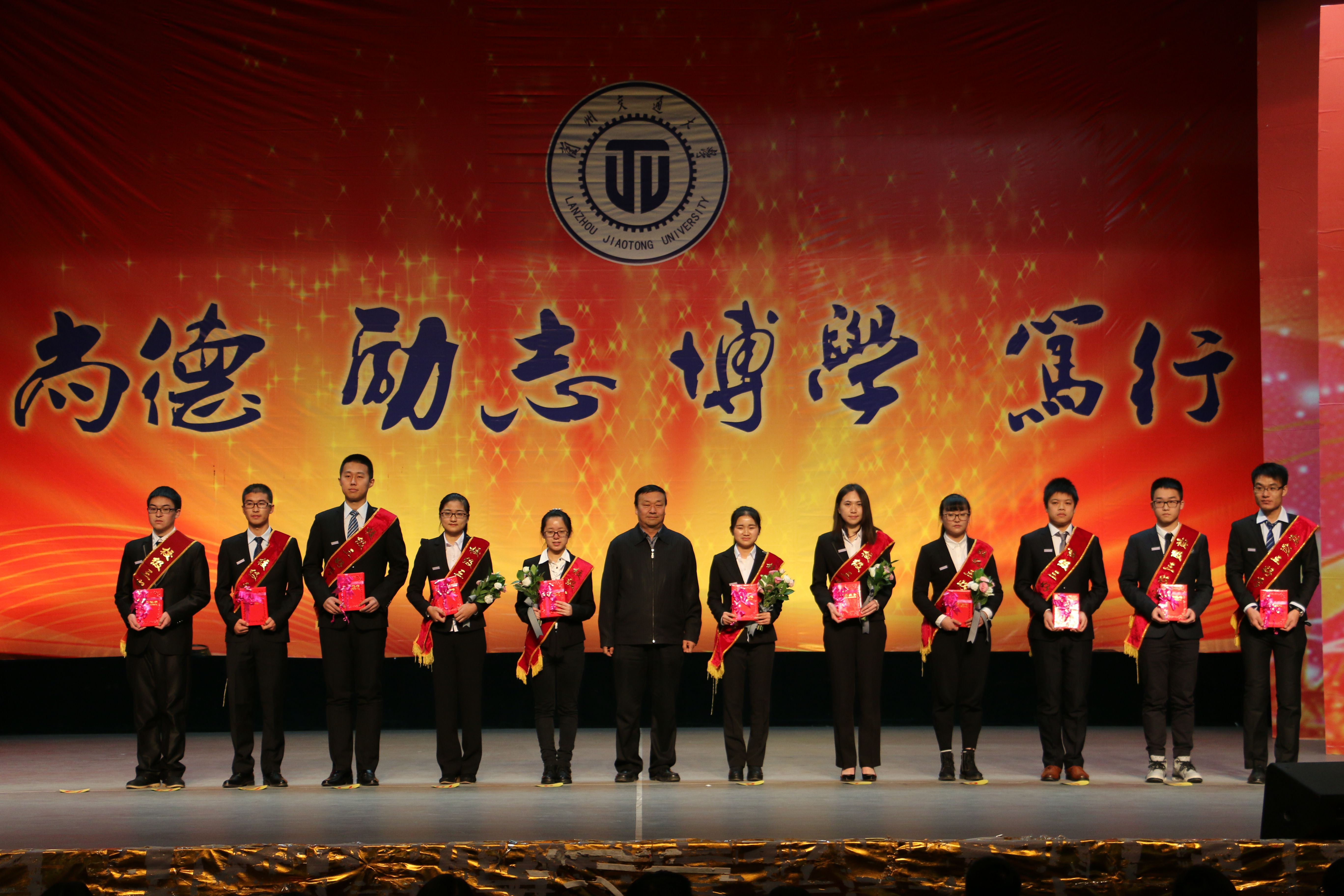 参会人员全体起立,高唱国歌,表彰大会在庄严热烈、喜庆祥和的气氛中拉开帷幕。学校党委副书记、常务副校长李引珍宣读了表彰文件。自动化与电气工程学院、土木工程学院、电子与信息工程学院、机电工程学院荣获2016年度“学生工作先进单位”称号,李秀琴等19名同志获得“学生管理工作先进个人”荣誉称号,王一君等13名同志获得“就业工作先进个人”荣誉称号,张燕等10名同志获得“优秀辅导员”荣誉称号,左丽娟等30名同志获得“优秀班主任”荣誉称号,肯巴提等两名同学获得国防生“雄鹰”奖学金,冯博等50名同学荣获“中天科技奖学金”,余建忠等100名同学荣获“天翼奖学金”,任弘扬等30名同学荣获“华成奖学金”,和平等10名留学生荣获“兰州交通大学优秀留学生”称号。