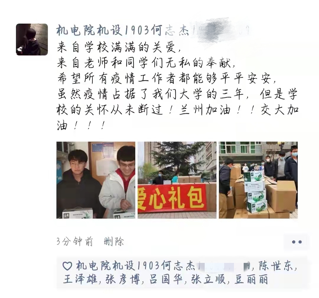 3月21日,学校为居住在校外东方公寓、桃海公寓的学生送去“爱心礼包”,共发放1280箱牛奶,送去温馨关爱。住在桃海公寓的自动化学院赵玉龙同学感动道:天寒心不寒,病毒无情人有情。感谢学校领导、老师的关心和爱护。同心抗疫,交大必胜,兰州加油!住在东方公寓的土木学院1903班全体学生发来感谢信,感谢在这场抗疫战斗中带给他们温暖和信心的学校领导、辅导员老师、志愿者同学。