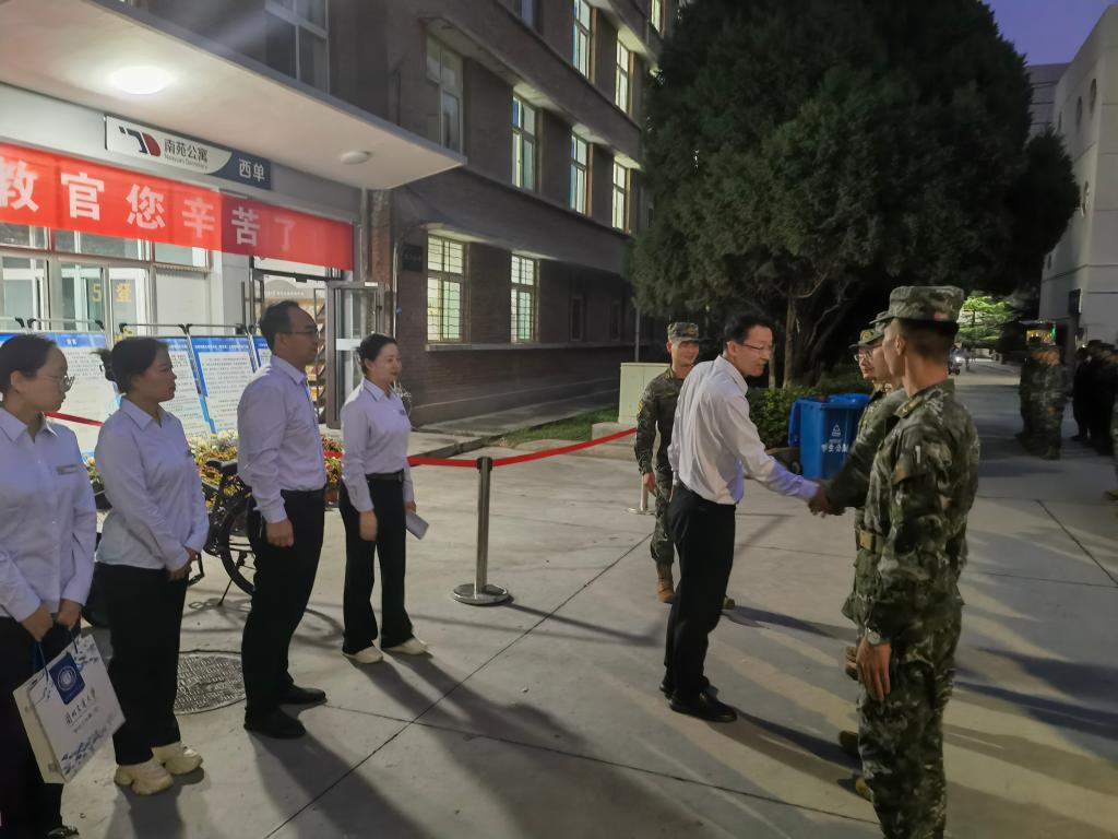活动开始前,副校长苏程在党委人民武装部相关负责人和工作人员的陪同下,来到教官入驻公寓,看望慰问军训承训教官,向支持学校军训工作的武警部队某部表示衷心感谢,对本次承训的全体教官致以亲切的问候。他详细了解了教官们的居住环境和后勤保障落实情况,表示学校将全力为教官施训提供保障,要求学校武装部不断加强与施训部队沟通,积极配合,共同做好新生军训工作。承训部队教官负责人表示一定不辜负部队首长、学校领导和广大师生的信任与重托,扎实做好军训各项工作,圆满完成军训工作任务。