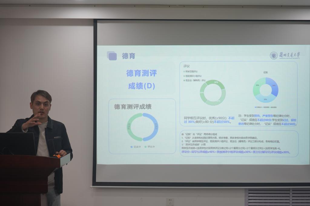 首先,木克老师依据《兰州交通大学2024年学生手册》为同学们详细介绍了综合测评流程、测评方法以及成绩计算方式、综测加分办法等,鼓励同学们积极参加竞赛和校内外活动,提高自身综合素质。