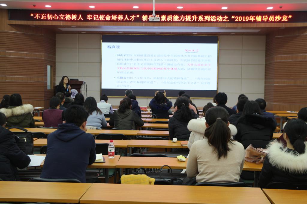 辅导员沙龙活动是本学期“不忘初心立德树人,牢记使命培养人才”辅导员素质能力提升系列活动的其中一项。自11月以来,学校相继开展了校内辅导员培训、新任辅导员素质拓展训练、优秀辅导员专业知识测试及综合能力考核、辅导员主题沙龙,以及外派辅导员参加教育部和甘肃省教育厅组织的思想政治工作骨干培训班等工作,多渠道加强辅导员队伍建设,提升辅导员素质能力。