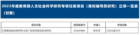 近日,教育部社会科学司发布了2023年度教育部人文社会科学研究专项任务项目(高校辅导员研究)评审结果,我校经济管理学院辅导员林育秀老师申报的《大数据赋能高校网络文化精准推送机制研究》获得2023年度教育部人文社会科学研究专项任务项目(高校辅导员研究)立项资助,是此项目中甘肃省唯一获批的项目。该项目研究领域前沿、立项难度大,是目前对针对辅导员层次最高、最具权威性的项目类别之一,也是衡量学校学生管理、服务和思想政治教育理论与实践工作的重要指标。