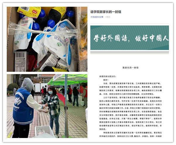 关注学生身心,加强人文关怀。疫情期间,学院制定了《外国语学院疫情期间校外学生就餐管理办法》,每天一日三餐饭点安排辅导员班主任引导学生取餐,做好校外学生就餐保障工作。对于在校外居住的同学,每日做好测温以及健康情况上报等工作。学生生病就医,班主任均全程陪同。学院购买了防疫物资,并给全体学生统一配发了口罩,给宿舍、固定教室配发了疫情防护消毒液等,较好地保障了学生的日常防护需求。在疫情刚开始蔓延之时,学院及时启动联系班级机制,党政主要负责人分别深入一年级所有班级,与学生开展线上交流,缓解一年级新生由于疫情影响所带来的焦虑情绪。学院班子全体成员按照学校工作安排,与巡察办、国际教育学院、档案馆、体育部等部门相关负责人,深入班级参加疫情防护主题班会,讲解疫情防护知识、疫情防控政策、学校疫情防控工作要求等,引导学生理性认识疫情,并通过交流,解答学生提出的问题,并将反应强烈的问题汇总后集中向学校进行了反馈。疫情期间,为了使家长了解真实情况,安抚家长情绪,做好家校联动,形成合力,学院撰写并通过班主任向家长转发了“致家长的一封信”,让各位家长及时了解学校疫情形势以及疫情防控各项措施,取得了很好的效果。